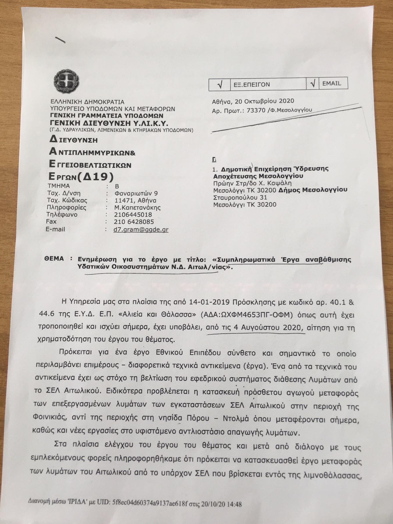 Δηλαδή ο δήμαρχος Μεσολογγίου γνώριζε τις προθέσεις και κυρίως τον οδικό χάρτη του σχεδιασμού της Περιφέρειας Δυτικής Ελλάδας εδώ και οχτώ μήνες. Μιας και σε αυτή την τηλεδιάσκεψη δόθηκαν οδηγίες στους ενδιαφερόμενους (δημάρχους, προέδρους ΤΟΕΒ, κλπ.) για εκδήλωση ενδιαφέροντος για συμμετοχή.