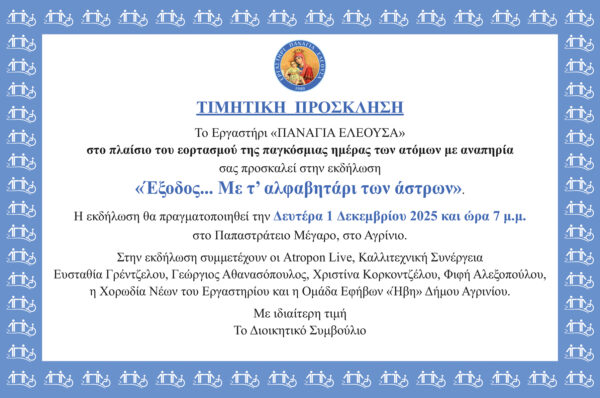 Στο πλαίσιο του εορτασμού της Παγκόσμιας Ημέρας Ατόμων με Αναπηρία, το Εργαστήρι «Παναγία Ελεούσα» πραγματοποιεί τη Δευτέρα 1 Δεκεμβρίου 2025 και ώρα 7 μ.μ. μια ιδιαίτερη επετειακή και καλλιτεχνική εκδήλωση στο Παπαστράτειο Μέγαρο, στο Αγρίνιο.