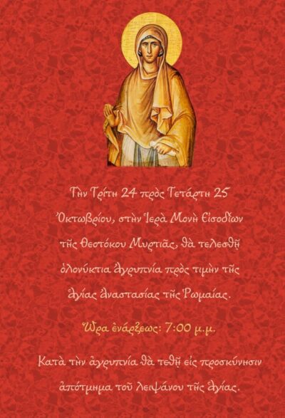 Την Τρίτη 24 Οκτωβρίου και ώρα 7:00μμ θα τελεστεί Ιερά Αγρυπνία στην Ιερά Μόνη Εισοδίων Θεοτόκου Μυρτιάς Τριχωνίδος επι τη εορτή της Αγίας Αναστασίας της Ρωμαίας.