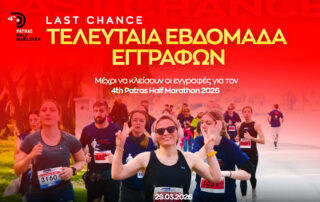 Μπαίνουμε στην τελευταία εβδομάδα εγγραφών για τον 4ο Patras Half Marathon και η στιγμή του αγώνα πλησιάζει. Ο Παιδικός Αγώνας έχει ήδη κλείσει, μετά το μεγάλο ενδιαφέρον που σημειώθηκε. Διάλεξε τη διαδρομή σου και έλα να τρέξουμε μαζί στην Πάτρα! Για περισσότερες πληροφορίες σχετικά με τον αγώνα και τις εγγραφές, επισκεφθείτε: patrashalfmarathon.gr