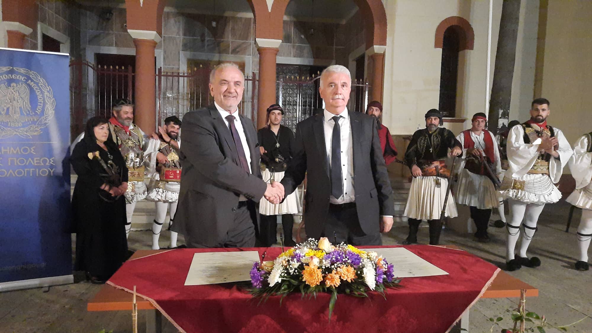 Στη συνέχεια ο Δήμαρχος Ι.Π Μεσολογγίου και ο Δήμαρχος Μετεώρων υπέγραψαν το “Πρωτόκολλο Αδελφοποίησης” επισφραγίζοντας μια ελπιδοφόρα συνεργασία και αντάλλαξαν δώρα.