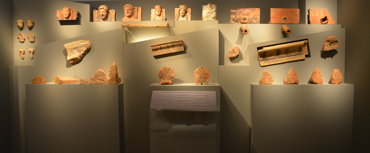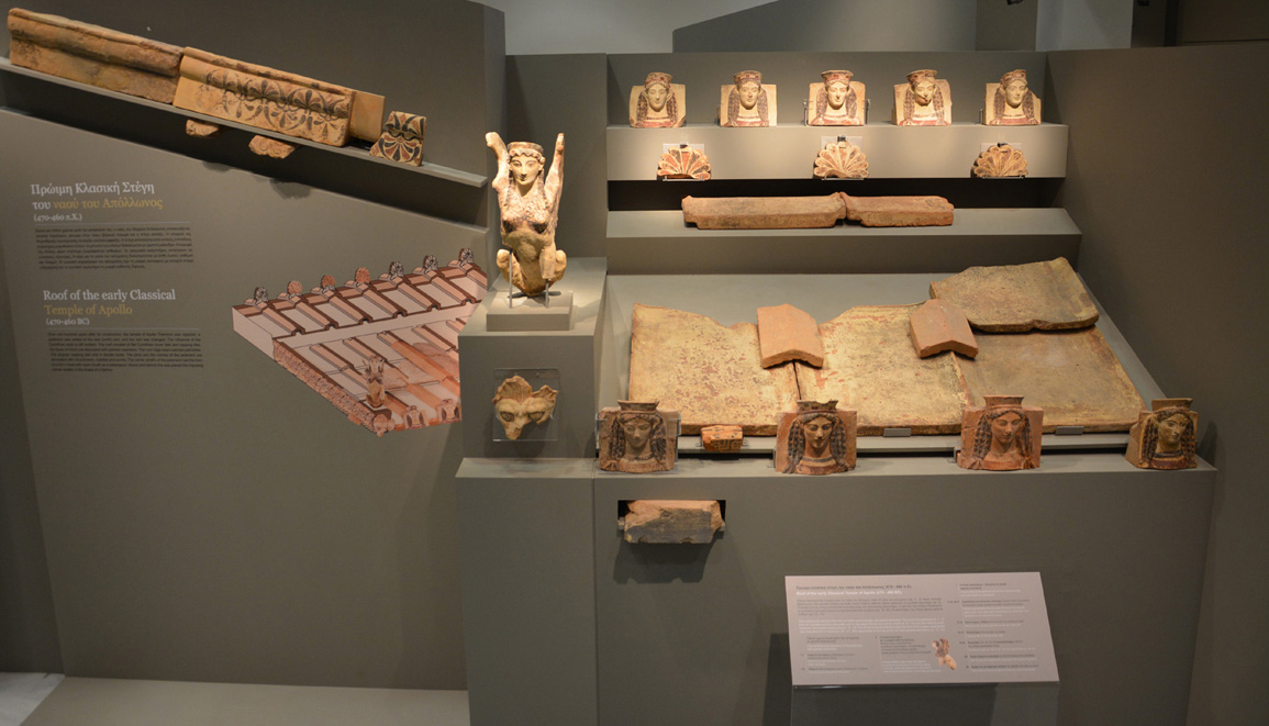 Ιδιαίτερη έμφαση έχει δοθεί στην ανασύνθεση των δύο στεγών του αρχαϊκού ναού του Απόλλωνος Θερμίου και στην τοποθέτηση των αρχιτεκτονικών μελών με τέτοιο τρόπο, ώστε να αναδεικνύεται ο διδακτικός χαρακτήρας της έκθεσης.