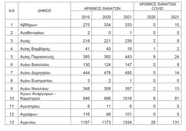 Τα δεδομένα για τους θανάτους λόγω Covid-19 ανά δήμο τη διετία 2020-2021, αφορούν συνολικά 20.849 θανάτους που καταγράφηκαν στη χώρα μας μέχρι τις 31 Δεκεμβρίου 2021. Διαβιβάστηκαν την Τετάρτη στη Βουλή από τον υπουργό Εσωτερικών Μάκη Βορίδη, μετά από σχετική ερώτηση της βουλευτού του ΜέΡΑ25 Μαρίας Απατζίδη.