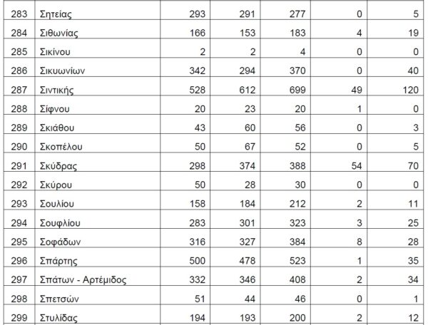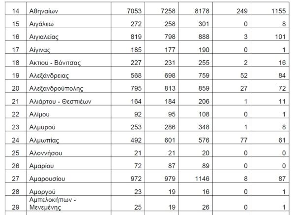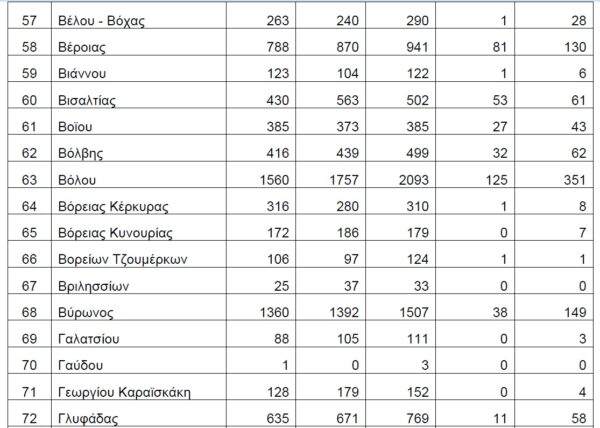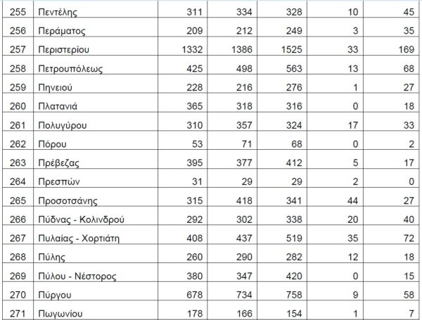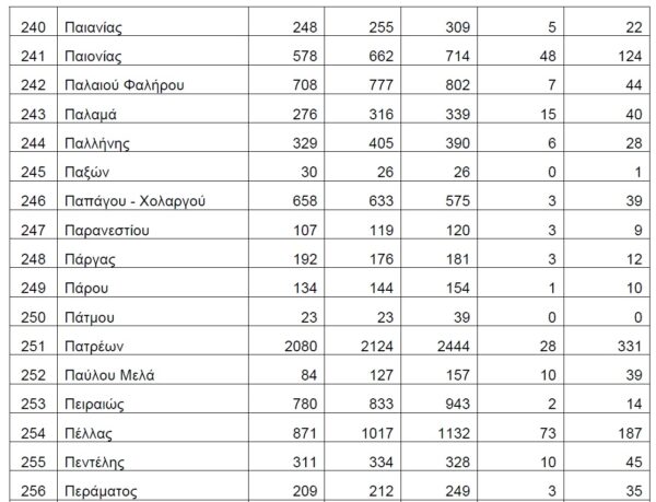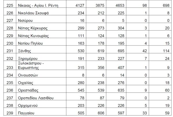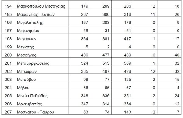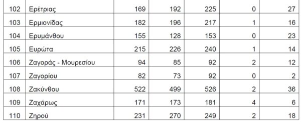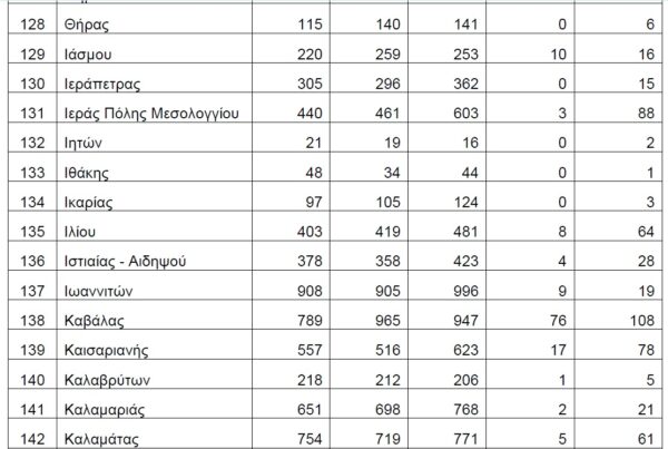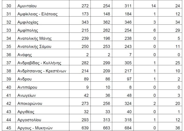 Βάσει των στοιχείων που διαβιβάστηκαν στη Βουλή, τη διετία 2020-2021, δεν έχουν δηλωθεί θάνατοι λόγω Covid19 στους Δήμους Αγαθονησίου, Αγίου Ευστρατίου, Αγκιστρίου, Αλοννήσου, Αμαρίου, Ανάφης, Αντιπάρου, Βριλησσίων, Γαύδου, Ελαφονήσου, Ηρωϊκής Νήσου Κάσου, Ηρωικής Νήσου Ψαρών, Κιμώλου, Κύθνου, Μεγανησίου, Μεγίστης, Νισύρου, Πάτμου, Σερίφου, Σικίνου, Σκύρου, Σύμης, Τήλου, Τήνου, Φολεγάνδρου, Φούρνων Κορσεών και Χάλκης.