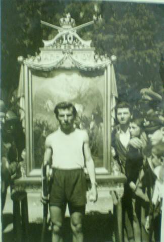 Στην φωτογραφία, ο πρώτος νικητής του Δρόμου Θυσίας 1953 Γιάννης Σταθέλος, μπροστά στην εικόνα της Εξόδου στον Κήπο των Ηρώων, μετά την λήξη του αγώνα και την απονομή.