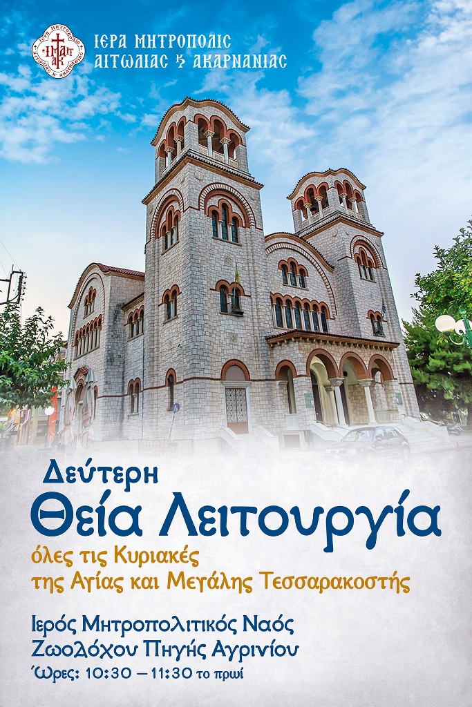 Η Ιερά Μητρόπολη Αιτωλίας και Ακαρνανίας στο πλαίσιο της ποιμαντικής μέριμνας για την εξυπηρέτηση των λατρευτικών αναγκών των νέων οικογενειών καθιερώνει την τέλεση δεύτερης Θείας Λειτουργίας όλες Κυριακές της Αγίας και Μεγάλης Τεσσαρακοστής στη πόλη του Αγρινίου.