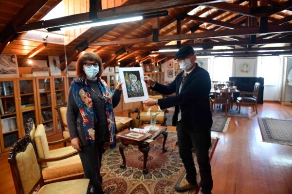 Προσφορά αναμνηστικού στον Sylvain Tesson, το χαρακτικό με τον λόρδο Βύρωνα, που φιλοτέχνησε ο Χαράκτης, Μιχάλης Κότσαρης από το Αιτωλικό για λογαριασμό της Β.Ε.Μ. Photo credits: Thomas Goisque