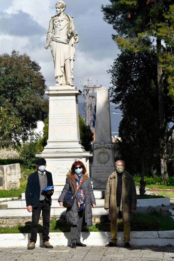 Στο Ανδριάντα του λόρδου Βύρωνα στον Κήπο των Ηρώων, έργο του γλύπτη Γεωργίου Βιτάλη (1881) , στο βάθρο του οποίου βρίσκεται θαμμένος μέσα σε λήκυθο, ο πνεύμονας του. Από αριστερά, Sylvain Tesson, Ροδάνθη-Ρόζα Φλώρου, Γιώργος Λύτρας. Photo credits: Thomas Goisque