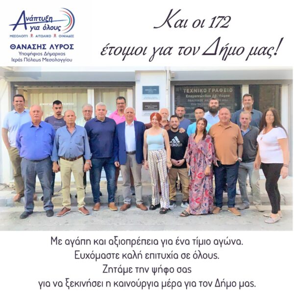 Κατατέθηκε χθες , Πέμπτη, 31 Αυγούστου 2023 το ψηφοδέλτιο του συνδυασμού “Ανάπτυξη για όλους”, με επι κεφαλής τον υποψήφιο Δήμαρχο Ι. Π. Μεσολογγίου, Θανάση Λύρο.