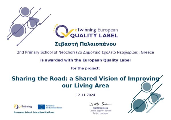 Με ιδιαίτερη χαρά και υπερηφάνεια, το 2ο Δημοτικό Σχολείο Νεοχωρίου Μεσολογγίου ανακοινώνει τη βράβευσή του με την Ευρωπαϊκή Ετικέτα Ποιότητας για το έργο eTwinning με τίτλο “Sharing the Road: a Shared Vision of Improving our Living Area / Μοιραζόμαστε το δρόμο: ένα κοινό όραμα για τη βελτίωση της περιοχής όπου διαμένουμε”.