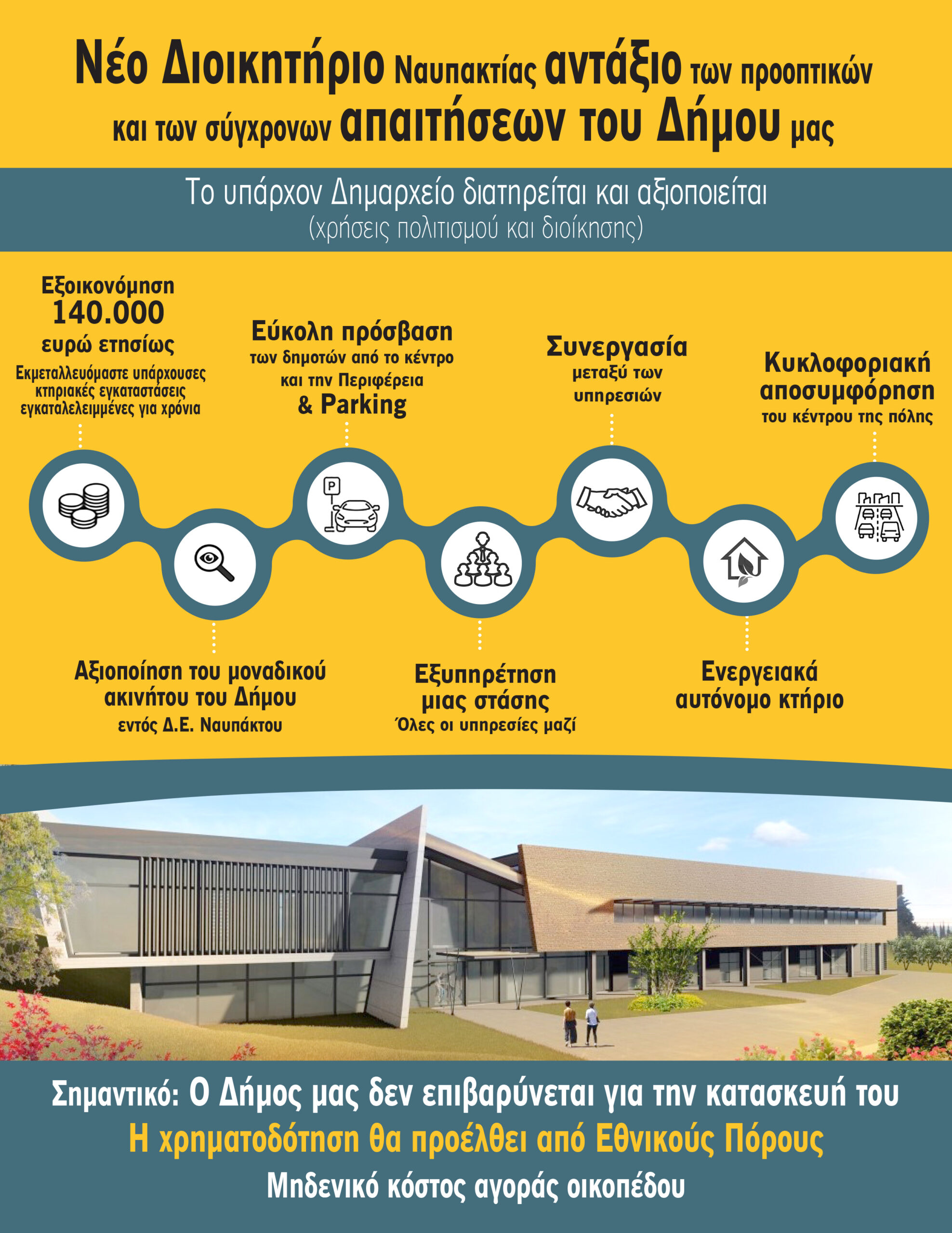 Ο Δήμος Ναυπακτίας, συνεκτιμώντας τα δεδομένα της πόλης της Ναυπάκτου σε επίπεδο κτηριακών υποδομών, και με γνώμονα την εξεύρεση της κατάλληλης λύσης, τόσο για την εξυπηρέτηση των πολιτών, όσο και για την εξοικονόμηση πόρων, προχωρά στην υλοποίηση ενός πολύ σημαντικού έργου.”