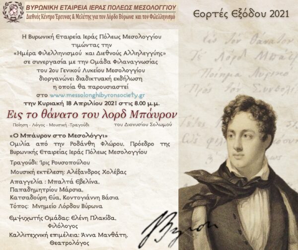 Την Εκδήλωση μπορείτε να δείτε διαδικτυακά στην Ιστοσελίδα της Βυρωνικής Εταιρείας, www.messolonghibyronsociety.gr την ΚΥΡΙΑΚΗ 18 Απριλίου στις 8.00 το βράδυ.