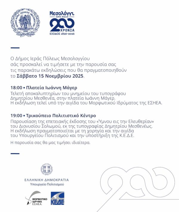 Οι εκδηλώσεις θα πραγματοποιηθούν στις 18:00 στην Πλατεία Ιωάννη Μάγερ, με την τελετή αποκαλυπτηρίων του μνημείου του Δημητρίου Μεσθενέα, και θα συνεχιστούν στις 19:00 στο Τρικούπειο Πολιτιστικό Κέντρο, με την παρουσίαση της επετειακής έκδοσης του “Ύμνου εις την Ελευθερίαν” του Διονυσίου Σολωμού, εκ τυπογραφίας Μεσθενέως.