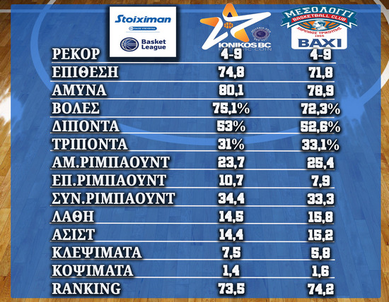 – Το Μεσολόγγι Baxi σημειώνει 71,77 πόντους ανά αγώνα, μέσος όρος που είναι καλύτερος μόνο από εκείνον του Ηρακλή. Παράλληλα είναι μία από τις δύο ομάδες με μέσο όρο μικρότερο των οχτώ επιθετικών ριμπάουντ (7,92).