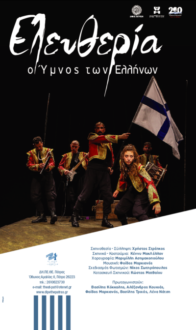 Στο πλαίσιο της επετείου για τα 200 χρόνια από την Ελληνική Επανάσταση του 1821, το Άρμα Θέσπιδος του ΔΗ.ΠΕ.ΘΕ. Πάτρας θα παρουσιάσει το έργο «Ελευθερία, ο ύμνος των Ελλήνων», στο Μεσολόγγι και συγκεκριμένα στο ανοιχτό θέατρο στο λιμάνι απόψε (11/6) στις 9 μμ.