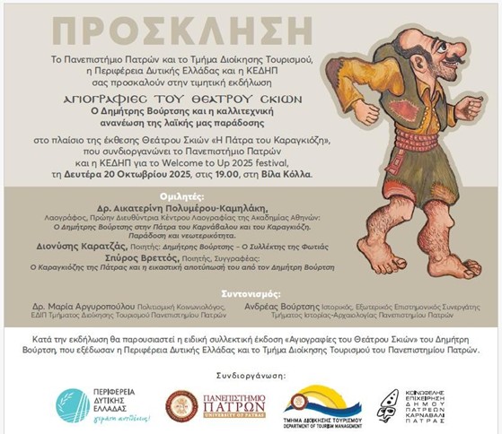 Το Τμήμα Διοίκησης Τουρισμού σας προσκαλεί στην τιμητική εκδήλωση με θέμα «Αγιογραφίες του Θεάτρου Σκιών – Ο Δημήτρης Βούρτσης και η καλλιτεχνική ανανέωση της λαϊκής μας παράδοσης», που θα πραγματοποιηθεί τη Δευτέρα 20 Οκτωβρίου 2025, στις 19:00, στη Βίλα Κόλλα (Πανεπιστήμιο Πατρών, Κουκούλι). Η εκδήλωση εντάσσεται στο πλαίσιο της έκθεσης Θεάτρου Σκιών «Η Πάτρα του Καραγκιόζη», συνδιοργάνωση του Πανεπιστημίου Πατρών, της Περιφέρειας Δυτικής Ελλάδας και της ΚΕΔΗΠ.
