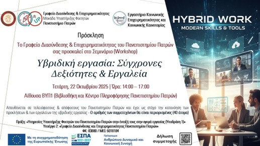 Στο πλαίσιο της Πράξης «Υπηρεσίες Υποστήριξης Φοιτητών του Πανεπιστημίου Πατρών στην ένταξή τους στην αγορά εργασίας» με Κωδικό ΟΠΣ 6018184 στη Δράση του Προγράμματος «Ανθρώπινο Δυναμικό και Κοινωνική Συνοχή 2021-2027», το Γραφείο Διασύνδεσης & Επιχειρηματικότητας, της Μονάδας Υποστήριξης Φοιτητών (Μ.Υ.Φ.), του Πανεπιστημίου Πατρών, πραγματοποιεί Σεμινάριο (workshop), την Τετάρτη 22 Οκτωβρίου 2025 και ώρα 14.00 – 17.00, στην Αίθουσα ΒΥΠ1, Βιβλιοθήκη & Κέντρο Πληροφόρησης Πανεπιστημίου Πατρών, με θέμα «Υβριδική εργασία: Σύγχρονες Δεξιότητες & Εργαλεία».