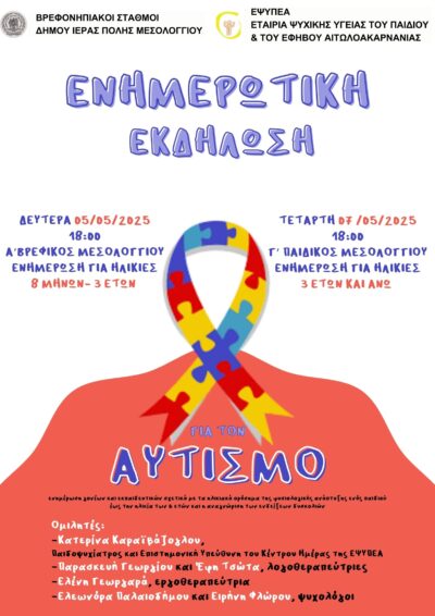 Οι Βρεφονηπιακοί Σταθμοί του Δήμου Ιεράς Πόλεως Μεσολογγίου, σε συνεργασία με την Εταιρία Ψυχικής Υγείας Παιδιού και Εφήβου Αιτωλοακαρνανίας (ΕΨΥΠΕΑ), σας προσκαλούν στις ενημερωτικές εκδηλώσεις που διοργανώνουν με θέμα τον Αυτισμό: