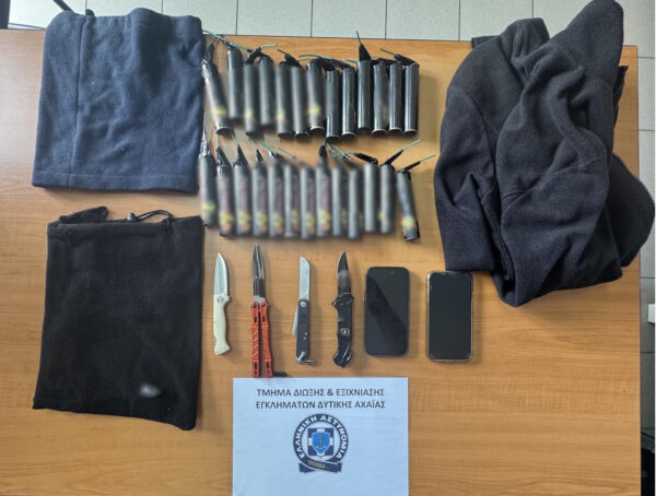 Οι δυο κατηγορούμενοι συνελήφθησαν από τους αστυνομικούς χθες το μεσημέρι, στην Κάτω Αχαΐα, καθώς βρέθηκαν και κατασχέθηκαν στις οικίες τους, μαχαίρια και κροτίδες και σχηματίστηκε δικογραφία σε βάρος τους για παράβαση της νομοθεσίας περί όπλων και βεγγαλικών, πυροτεχνημάτων, παιδικών αθυρμάτων, φωτοβολίδων και συσκευή εκτόξευσης.