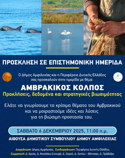 Ο Δήμος Αμφιλοχίας, σε συνεργασία με την Περιφέρεια Δυτικής Ελλάδας, διοργανώνει Επιστημονική Ημερίδα με θέμα: «Αμβρακικός Κόλπος: Προκλήσεις, Δεδομένα, Στρατηγικές Βιωσιμότητας», το Σάββατο 6 Δεκεμβρίου 2025, στις 11:00 π.μ., στην Αίθουσα Δημοτικού Συμβουλίου του Δημαρχείου Αμφιλοχίας.
