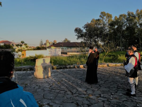 Με απόλυτα λιτό τρόπο αντιπροσωπεία του Συλλόγου Πανηγυριστών “Ο Άγιος Συμεών” με τις παραδοσιακές του φορεσιές κατέθεσε στεφάνι στην “Ντάπια Λουνέτα” που βρίσκεται στον αύλειο χώρο του Τρικούπειου.