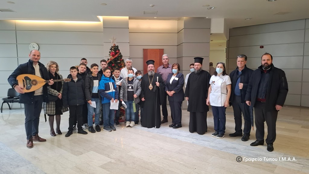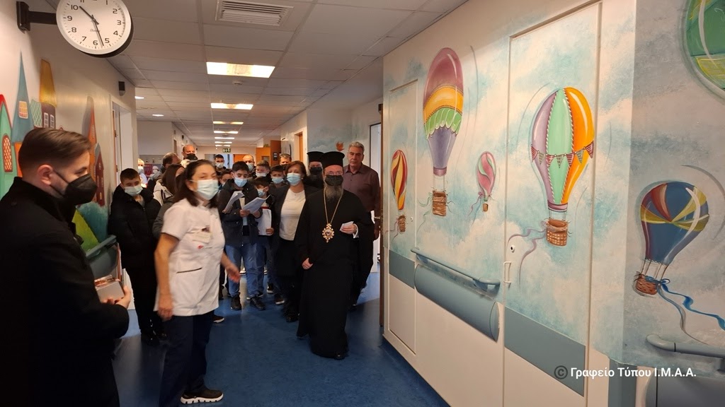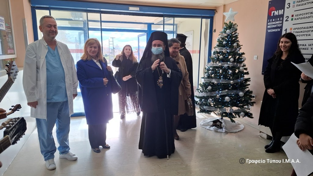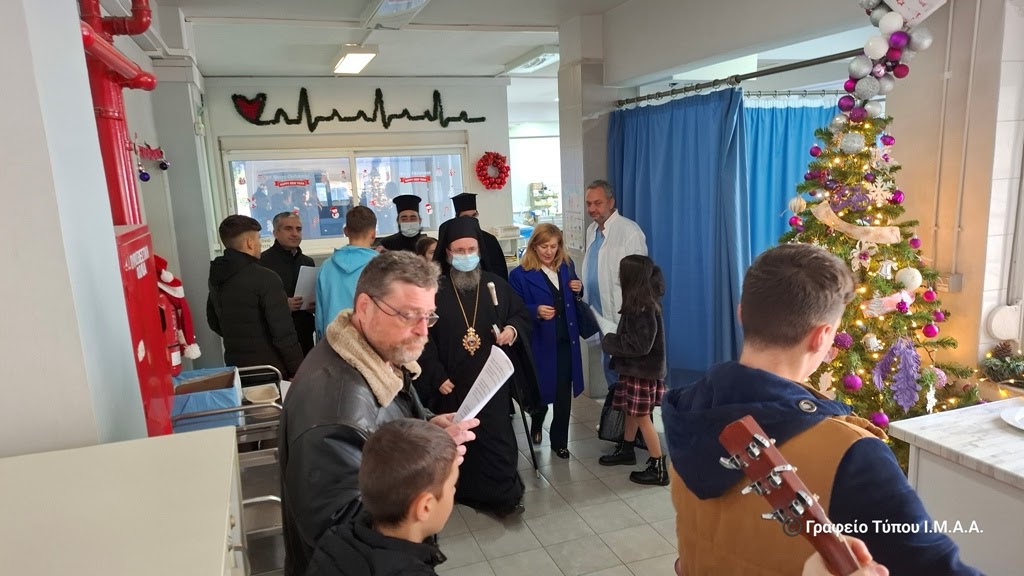 Ο Σεβασμιώτατος επισκέφθηκε τους θαλάμους νοσηλείας και αντάλλαξε εορταστικές ευχές με τους ασθενείς, τους συνοδούς, το ιατρικό και το νοσηλευτικό προσωπικό, ενώ οι νέοι έψαλλαν κάλαντα και τραγούδησαν χριστουγεννιάτικα τραγούδια, με τη συνοδεία παραδοσιακών οργάνων.