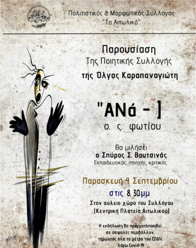 Για την νέα έκδοση θα μιλήσει ο Σπύρος Σ. Βουτσινάς εκπαιδευτικός, ποιητής, κριτικός , ενώ τον συντονισμό της εκδήλωσης θα κάνει ο Μιχάλης Κότσαρης, ζωγράφος /χαράκτης και πρόεδρος του Π.Μ. Συλλόγου “Το Αιτωλικό”