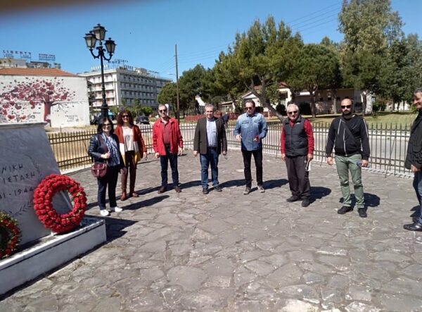 Στην κατάθεση στεφάνου πήρε μέρος ολιγομελής αντιπροσωπεία που αποτελούνταν από τον  Μάκη Θεοφιλάτο μέλος της Κ.Ε., τη Μαρία Τριανταφύλλου πρώην βουλευτή, την Καλλιρρόη Πατρινού συντονίστρια της Ο.Μ. Μεσολογγίου καθώς και μέλη της Συντονιστικής Επίτροπής.