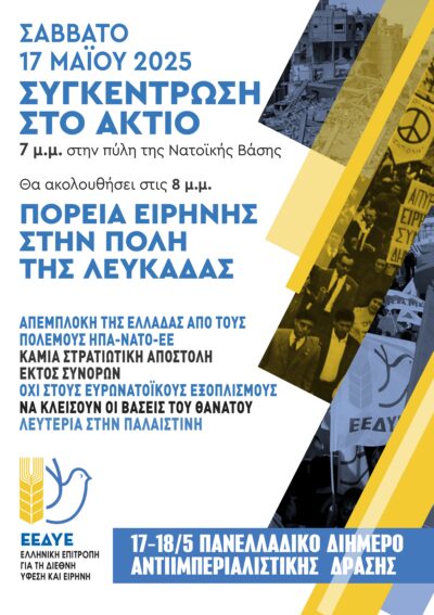 Νέες και νέοι, εργαζόμενοι και συνταξιούχοι, η Επιτροπή Ειρήνης Αιτωλοακαρνανίας, στο πλαίσιο του Πανελλαδικού Αντιμπεριαλιστικού Διημέρου Δράσης της Ελληνικής Επιτροπής για τη Διεθνή Ύφεση και Ειρήνη (ΕΕΔΥΕ) σας καλεί σε μαζική συμμετοχή το Σάββατο 17 Μάη, στη συγκέντρωση στο Άκτιο στις 7μμ, στην πύλη της ΝΑΤΟϊκής βάσης και στην πορεία Ειρήνης στην πόλη της Λευκάδας, στις 8μμ.