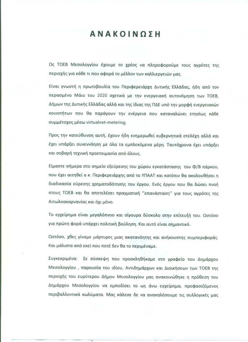 Έντονη κριτική στη δημοτική αρχή του Μεσολογγίου ασκεί με γραπτή του δήλωση ο πρόεδρος του ΤΟΕΒ Μεσολογγίου, Κώστας Καραδήμας σχετικά με το ζήτημα της ενεργειακής κοινότητας των ΤΟΕΒ.