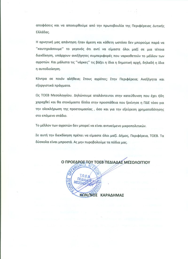 Ο κ. Καραδήμας στην ανακοίνωσή του επιβεβαιώνει την σχετική μας ανάρτηση για τα όσα συζητήθηκαν στη χθεσινή συνάντηση του δημάρχου Μεσολογγίου με προέδρους ΤΟΕΒ της περιοχής (ΔΙΑΒΆΣΤΕ ΕΔΏ).