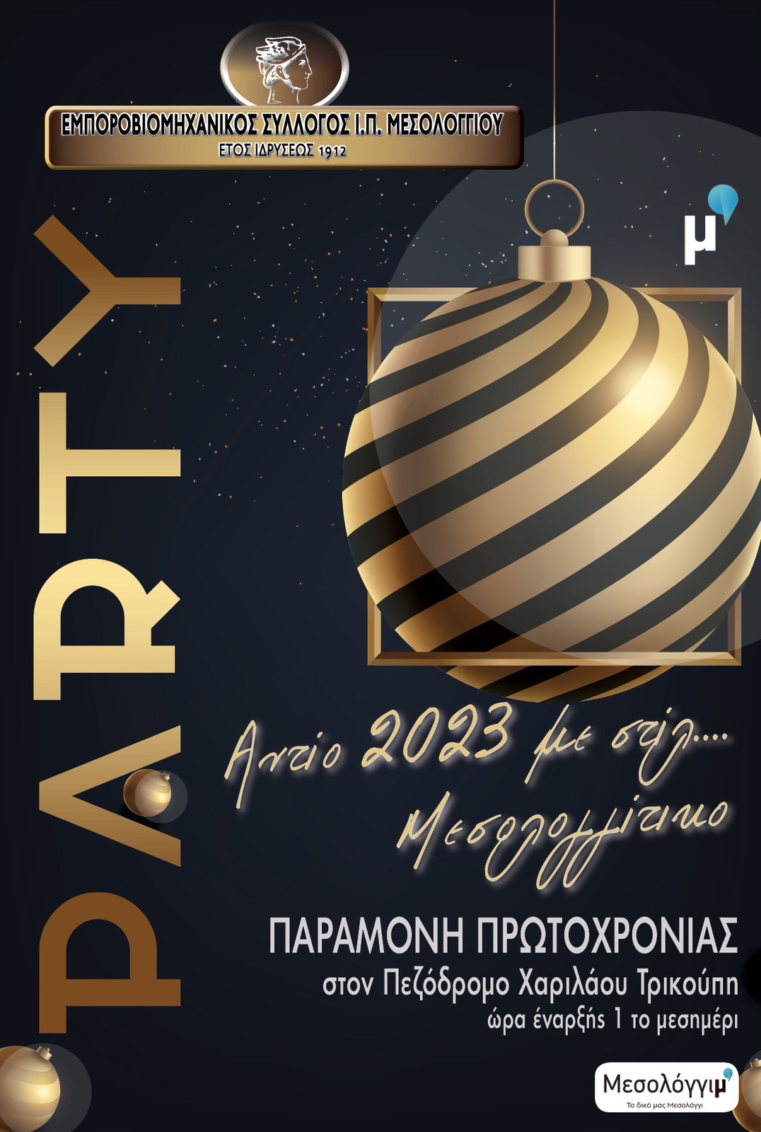 Ο Εμποροβιομηχανικός Σύλλογος Μεσολογγίου σε συνεργασία με το Messolonghim σας προσκαλούν στο μεγάλο πρωτοχρονιάτικο πάρτι των καταστημάτων της πόλης μας στον πεζόδρομο Χαρ. Τρικούπη (έμπροσθεν καταστήματος Icon Store στις 31/12, με ώρα έναρξης 13:00 το μεσημέρι), για να αποχαιρετήσουμε μαζί το 2023 και να ετοιμαστούμε με τον καλύτερο τρόπο για την υποδοχή του 2024!