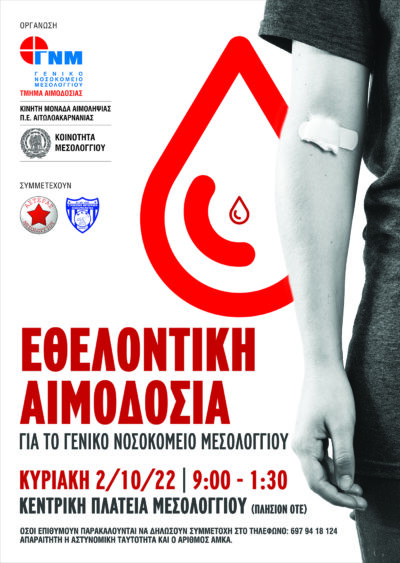 Την Κυριακή 2/10/2022 σας καλούμε στην κεντρική πλατεία Μεσολογγίου όπου θα πραγματοποιηθεί εθελοντική αιμοδοσία για το Γενικό Νοσοκομείο Μεσολογγίου ΧΑΤΖΗΚΩΣΤΑ, από τις 9.00 π.μ. μέχρι 1.30 μ.μ..