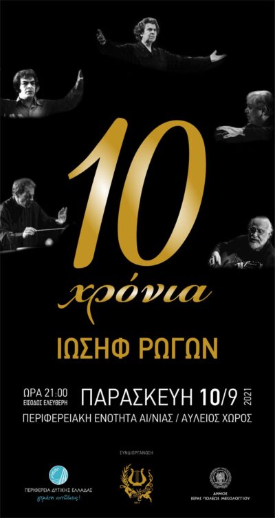 Την Παρασκευή 10 Σεπτεμβρίου 2021 και ώρα 21:00 θα πραγματοποιηθεί στον εξωτερικό χώρο της Περιφερειακής Κοινότητας Αιτωλοακαρνανίας (Πρώην Νομαρχία) στο Μεσολόγγι, η επετειακή εκδήλωση για την λειτουργία των 10 χρόνων από την ίδρυση του Μουσικού Ομίλου Ιεράς Πόλεως Μεσολογγίου «Ιωσήφ Ρωγών» , υπό την αιγίδα της Περιφέρειας Δυτικής Ελλάδος και του Δήμου Ιεράς Πόλεως Μεσολογγίου.