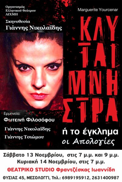 Ο Οργανισμός Ελληνικού Θεάτρου ΑΙΧΜΗ θα παρουσιάσει σε τρεις παραστάσεις το έργο “Κλυταιμνήστρα ή το Έγκλημα, οι Απολογίες” της Μαργκερίτ Γιουρσενάρ σε σκηνοθεσία ΓΙΑΝΝΗ ΝΙΚΟΛΑΪΔΗ στο Μεσολόγγι.