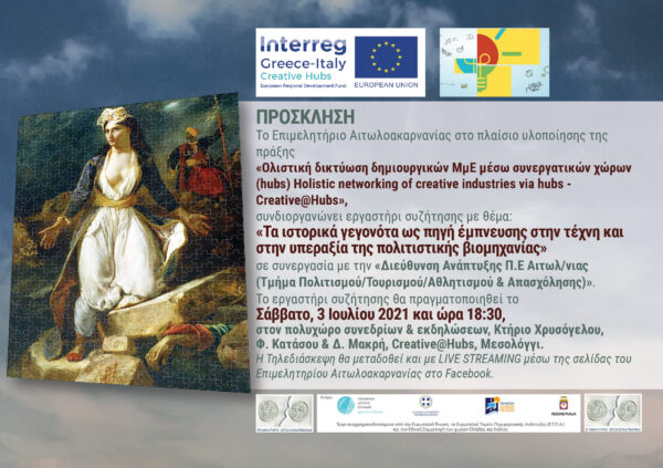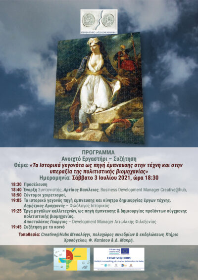 Τα ιστορικά γεγονότα ως πηγή έμπνευσης στην τέχνη και στην υπεραξία της πολιτιστικής βιομηχανίας” είναι το αντικείμενο εργαστηρίου συζήτησης που θα γίνει στο Μεσολόγγι και συγκεκριμένα σε συνεδριακή αίθουσα του “Αρχοντικού Χρυσογέλου” το Σάββατο 3 Ιουλίου στις 6:30μμ.