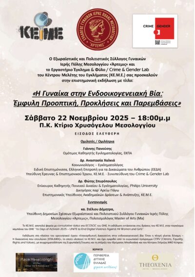 Σε μια ιδιαίτερα κρίσιμη κοινωνική συγκυρία, ο Εξωραϊστικός και Πολιτιστικός Σύλλογος Γυναικών Ιερής Πόλης Μεσολογγίου «Άρτεμις» συνδιοργανώνει με το Εργαστήριο Έγκλημα & Φύλο / Crime & Gender Lab του Κέντρου Μελέτης του Εγκλήματος (ΚΕ.Μ.Ε.) μια σημαντική επιστημονική εκδήλωση με θέμα την ενδοοικογενειακή βία και τις σύγχρονες προκλήσεις της μέσα από την έμφυλη οπτική.