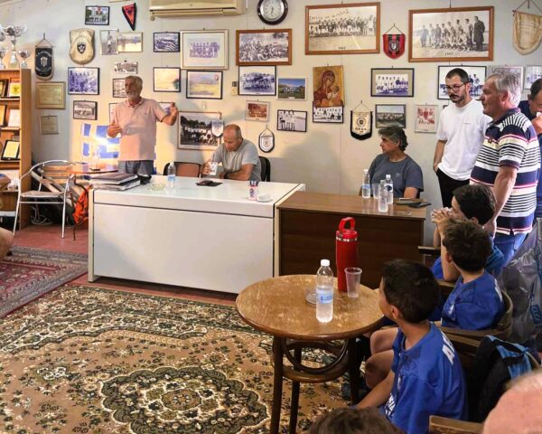 Οι παλαίμαχοι ποδοσφαιριστές και ενεργά μέλη της Διοίκησης, Γιώργος Καραμανόπουλος, Ανδρέας Μαργέλης, Σπύρος Χαϊδάκης, Βύρωνας Παναγιωτόπουλος και Κώστας Μπαλαούρας, υποδέχθηκαν με θέρμη και ενθουσιασμό τους νεαρούς “κανονιέρηδες”, σε μια συνάντηση με έντονη παιδαγωγική και ιστορική αξία.