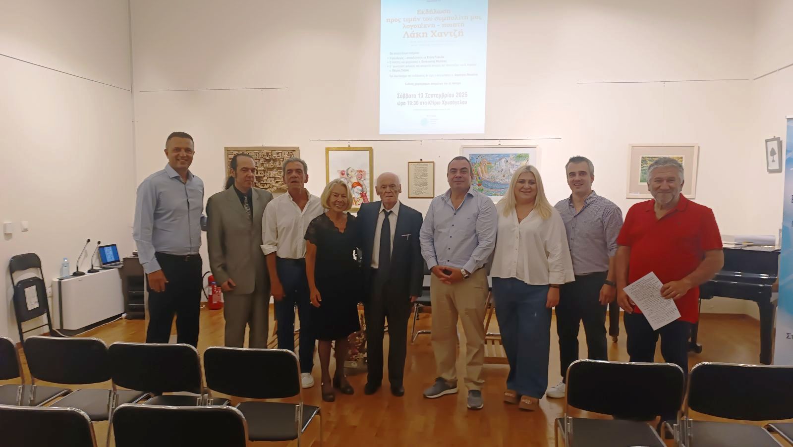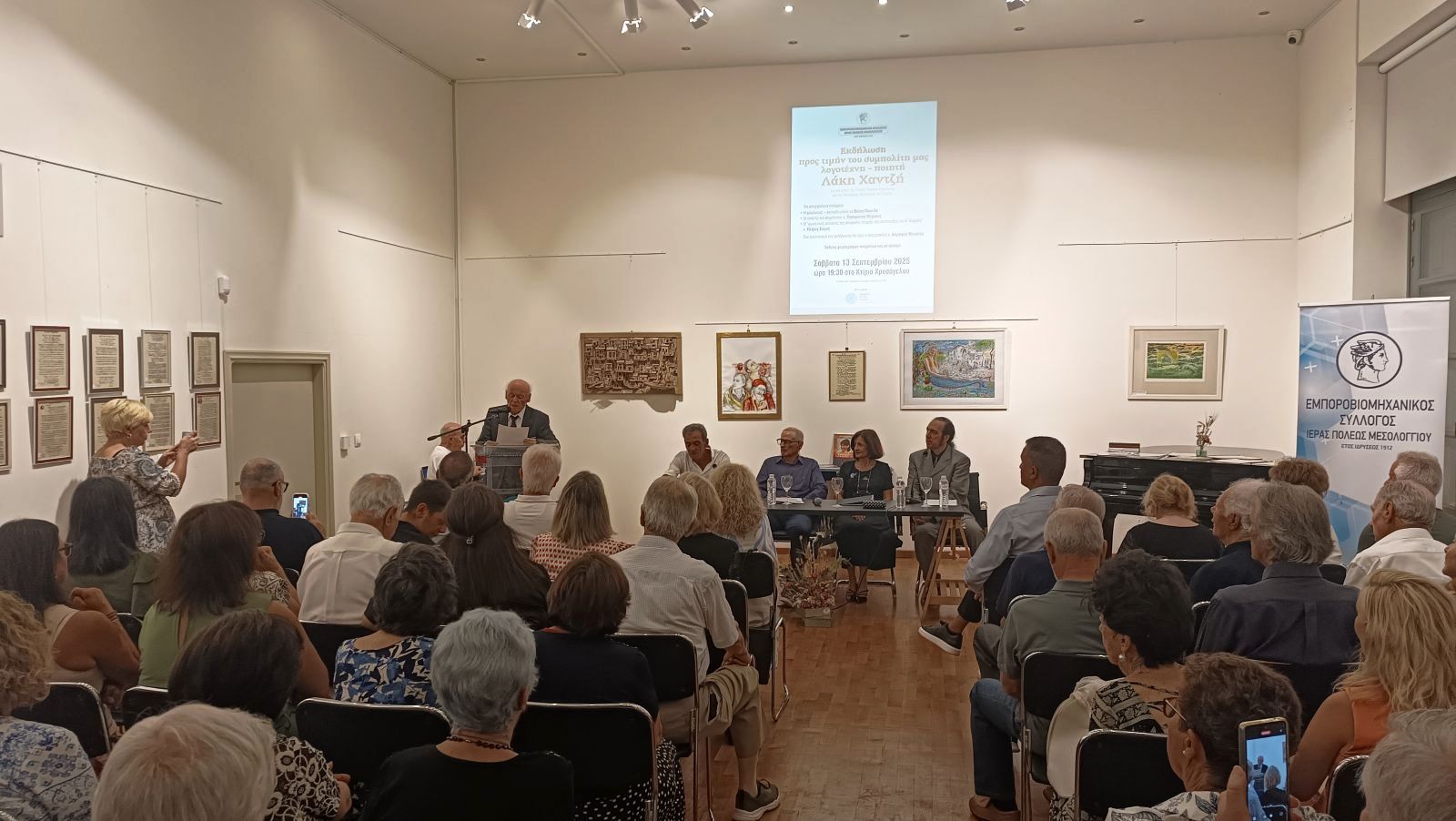 Μέσα σε κλίμα ιδιαίτερης συγκίνησης πραγματοποιήθηκε το Σάββατο 13 Σεπτεμβρίου στην κατάμεστη αίθουσα του Κτιρίου Χρυσόγελου η εκδήλωση που διοργάνωσε ο Εμποροβιομηχανικός Σύλλογος Μεσολογγίου προς τιμήν του Μεσολογγίτη λογοτέχνη και ποιητή Λάκη Χαντζή, για την ακούραστη και διαχρονική προσφορά του στην πνευματική ζωή της πόλης.