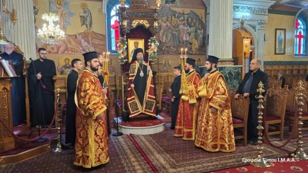 Συλλειτούργησαν ο Πρωτοσύγκελλος Αρχιμ. Θεόκλητος Ράπτης, ο Γενικός Αρχιερατικός Επίτροπος Αρχιμ. Ιωσήφ Ζωγράφος και πολλοί Ιερείς, ενώ τον θείο λόγο εκφώνησε ο π. Θεόκλητος, ο οποίος αναφέρθηκε στον βίο των Αγίων της ημέρας και στο έργο του Σεβασμιωτάτου, ευχόμενος «δημιουργική μακροημέρευση» στο ποιμαντικό του έργο.