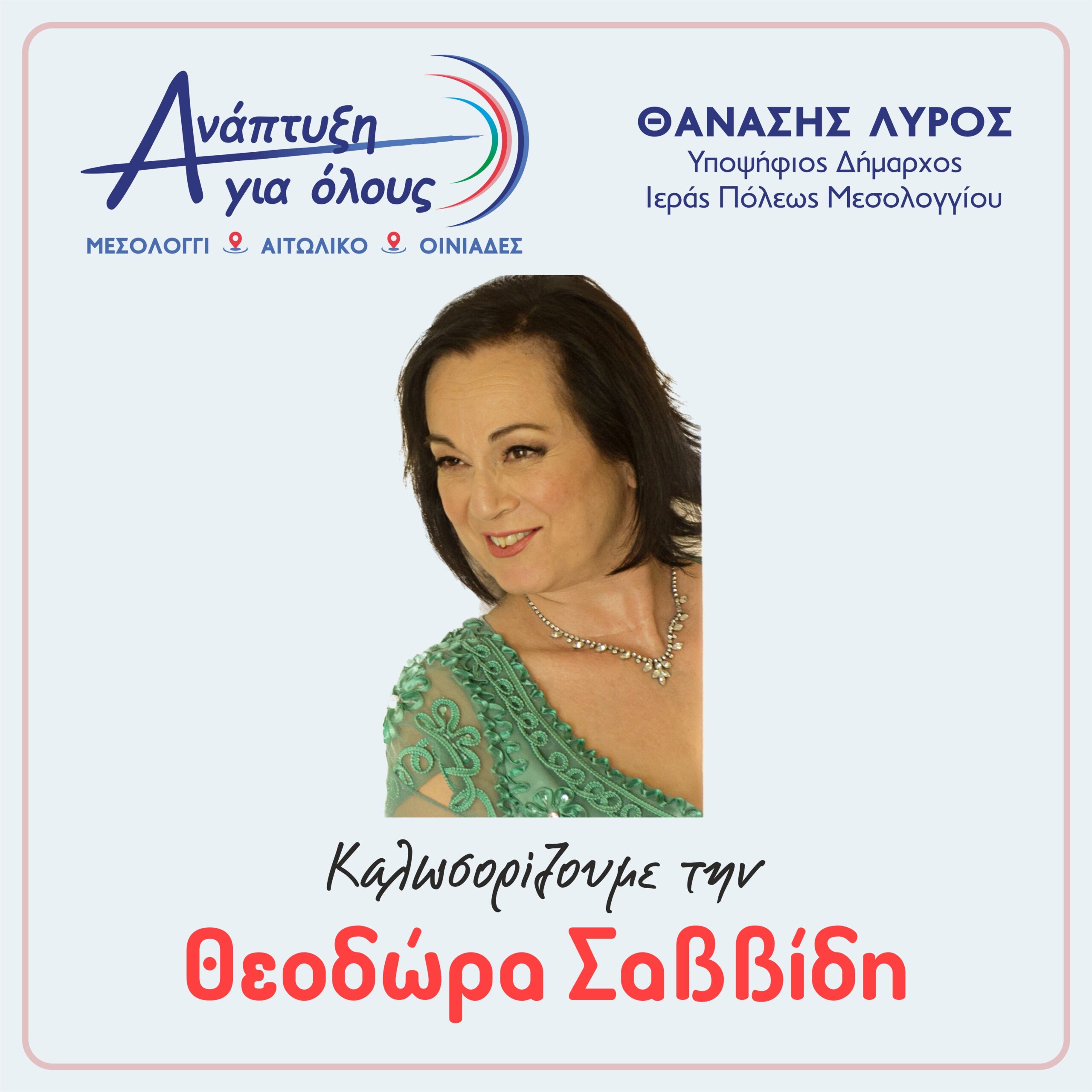 Ευχαριστώ την ΘΕΟΔΩΡΑ ΣΑΒΒΙΔΗ – ΚΑΒΑΓΙΑ, από το Μεσολόγγι, και την καλωσορίζω στον καλό και τίμιο προεκλογικό μας αγώνα, για να πάμε τον Δήμο μας εκεί που του αξίζει.