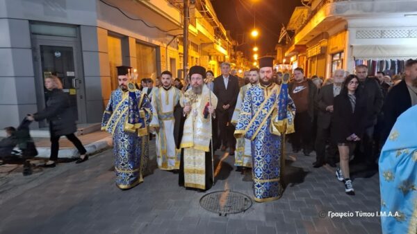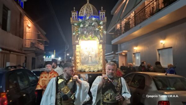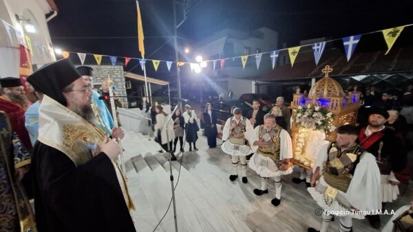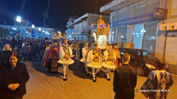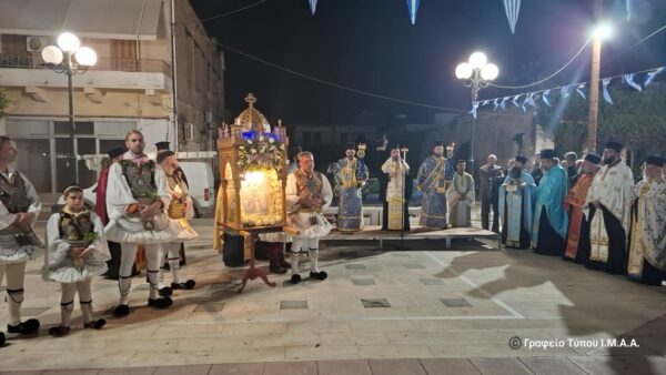 Αμέσως μετά τον πανηγυρικό Εσπερινό προέστη της λιτανεύσεως της Ιεράς Εικόνας της Θεοτόκου στους δρόμους του Νεοχωρίου.