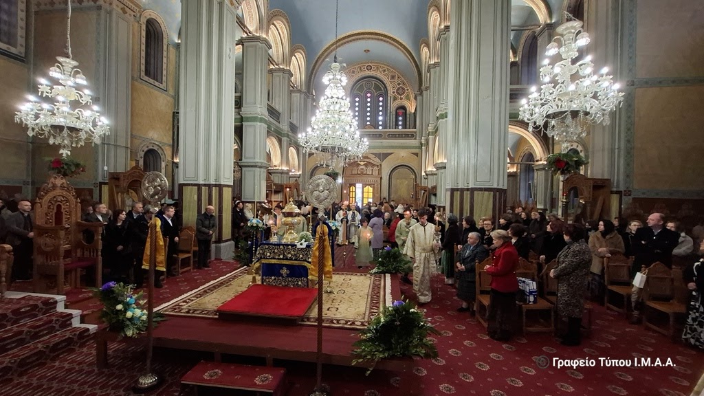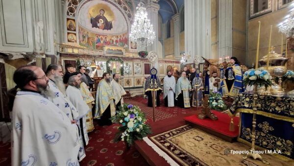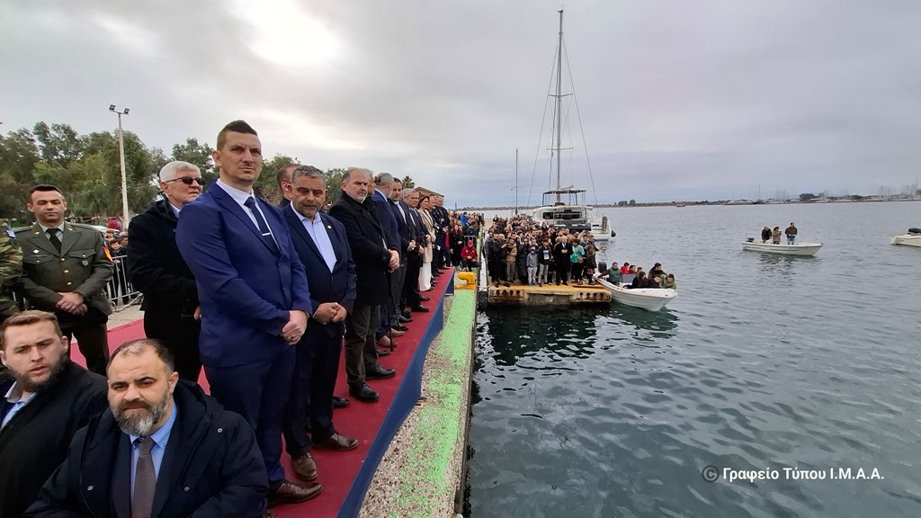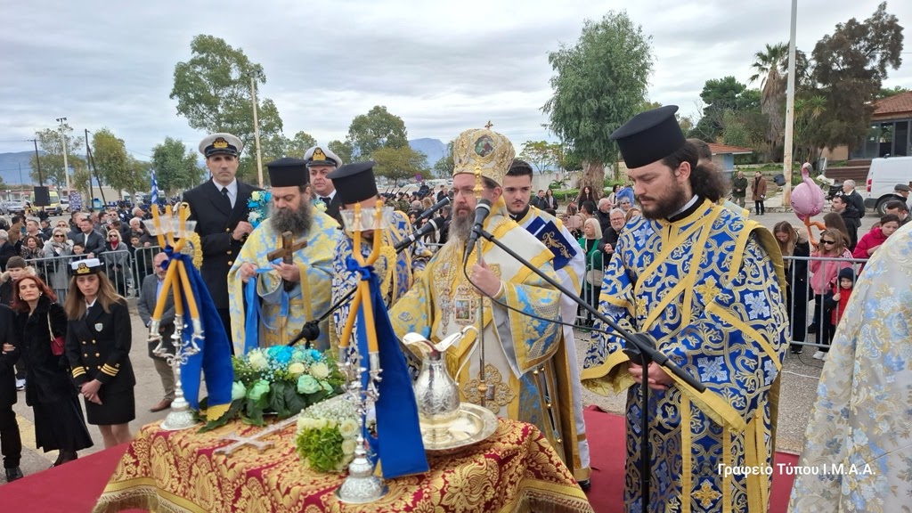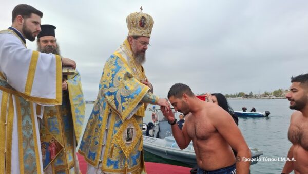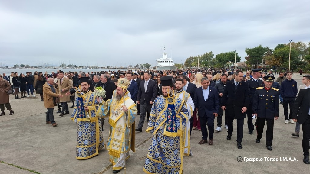 Αμέσως μετά τη Θεία Λειτουργία, ο Σεβασμιώτατος τέλεσε την Ακολουθία του Μεγάλου Αγιασμού εντός του Ναού και στη συνέχεια, με λιτανευτική πομπή, άπαντες κατευθύνθηκαν στο Λιμάνι της Ιεράς Πόλεως, όπου πραγματοποιήθηκε η Τελετή Κατάδυσης του Τιμίου Σταυρού και ο Αγιασμός των Υδάτων.