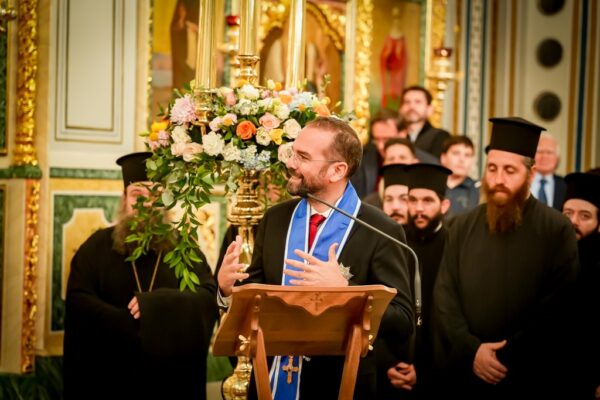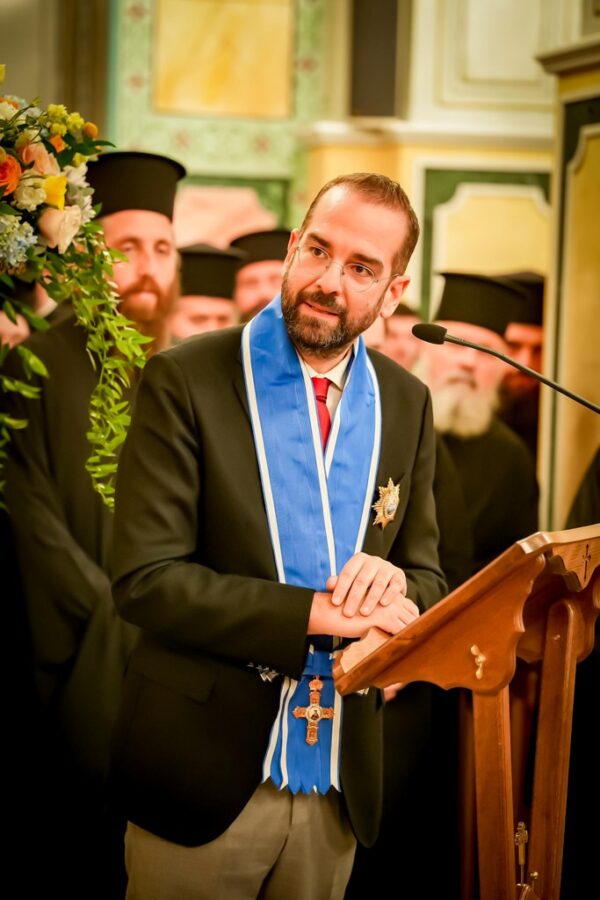 Θα μου επιτρέψετε να αναφερθώ στον απόντα σωματικά, λόγω ανειλημμένων υποχρεώσεων, αλλά νοερώς ευρισκόμενο ανάμεσά μας, Μεγάλο Ευεργέτη ολοκλήρου της Ορθοδοξίας, τον κ. Αθανάσιο Μαρτίνο. Έναν πιστό άνθρωπο του Θεού, ο οποίος καθημερινά προσφέρει μεγάλα έργα λατρευτικής, φιλανθρωπικής, εκπαιδευτικής και κοινωνικής δράσεως στην πατρίδα μας. Έναν άνθρωπο που αγαπά και στηρίζει τα πρεσβυγενή Πατριαρχεία, που σέβεται και αγαπά το Αγιώνυμο Όρος και ολόκληρη την Ορθοδοξία.