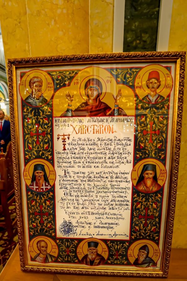 Η εκδήλωση ολοκληρώθηκε με την απονομή από τον Σεβασμιώτατο, του αναμνηστικού που εξέδωσε η Ιερά Μητρόπολη για το επετειακό έτος 2026 στον Δήμαρχο Ιεράς Πόλεως Μεσολογγίου και στους εκπροσώπους τους κ. Αθανασίου Μαρτίνου.