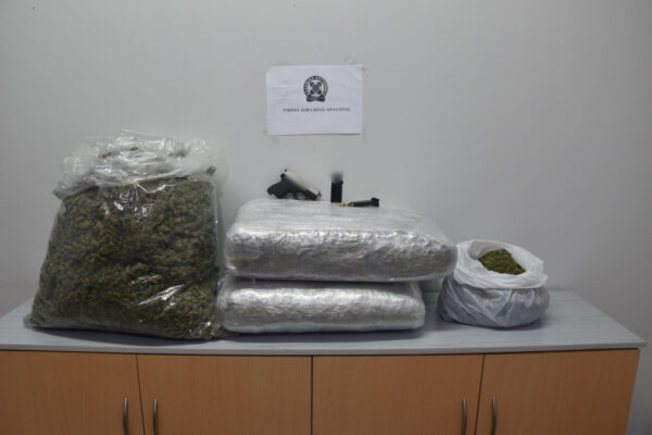 Οι αστυνομικοί κατέσχεσαν περίπου (20) κιλά κάνναβης, ένα πιστόλι και τέσσερα φυσίγγια