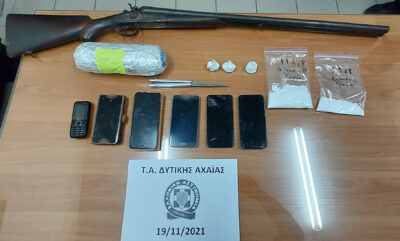 Σε έρευνα που ακολούθησε στην οικία του άνδρα, σε περιοχή της Ηλείας, οι αστυνομικοί του Τμήματος Ασφάλειας Δυτικής Αχαΐας, βρήκαν και κατέσχεσαν (141,8) γραμμάρια σκόνης άγνωστης χημικής ουσίας, ένα κυνηγετικό όπλο, το οποίο κατείχε παράνομα, ένα μαχαίρι τύπου πεταλούδα και τρία κινητά τηλέφωνα.