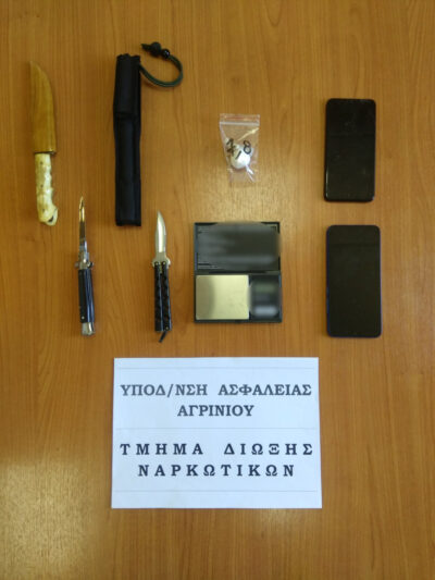 Συνελήφθη, χθες το πρωί, στο Αγρίνιο, από αστυνομικούς του Τμήματος Δίωξης Ναρκωτικών της Υποδιεύθυνσης Ασφαλείας Αγρινίου, ένας ημεδαπός άνδρας, διότι σε έρευνα που πραγματοποιήθηκε στην οικία του, βρέθηκαν και κατασχέθηκαν τα εξής :
