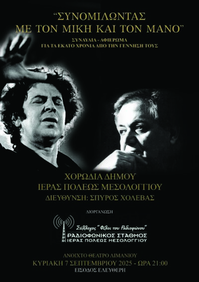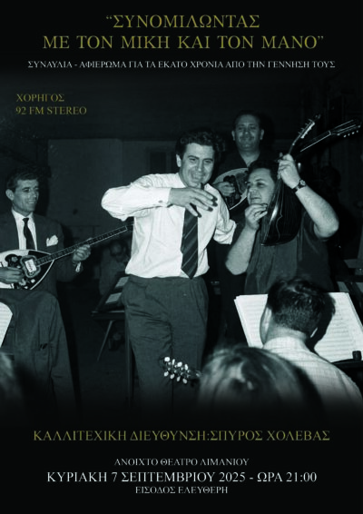 Η συναυλία με τίτλο «Συνομιλώντας με τον Μίκη και τον Μάνο», θα πραγματοποιηθεί την Κυριακή 7 Σεπτεμβρίου 2025 και ώρα 21:00, στο Ανοιχτό Θέατρο Λιμανιού με ελεύθερη είσοδο για το κοινό.