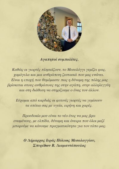 Ο Δήμαρχος Ιερής Πόλεως Μεσολογγίου, Σπυρίδων Β. Διαμαντόπουλος, στο εορταστικό του μήνυμα τονίζει ότι οι γιορτές είναι μια περίοδος φωτός, αλληλεγγύης και ενότητας, ευχόμενος σε όλους υγεία, ειρήνη και χαρά.